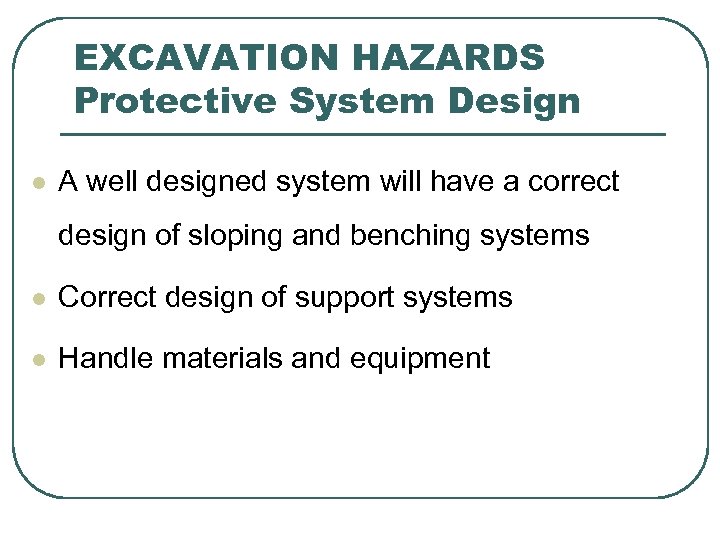 EXCAVATION HAZARDS Protective System Design l A well designed system will have a correct design of sloping and benching systems l Correct design of support systems l Handle materials and equipment