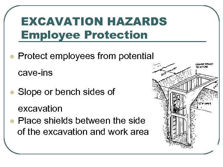 EXCAVATION HAZARDS Employee Protection l Protect employees from potential cave-ins l Slope or bench sides of excavation l Place shields between the side of the excavation and work area