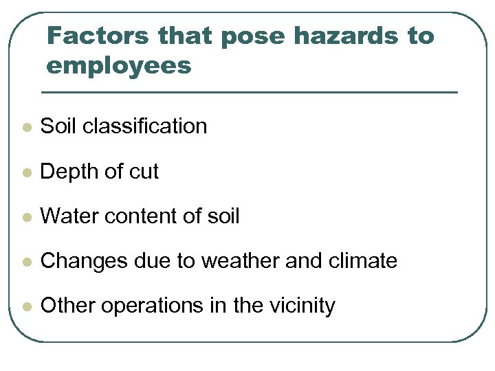 Factors that pose hazards to employees l Soil classification l Depth of cut l Water content of soil l Changes due to weather and climate l Other operations in the vicinity
