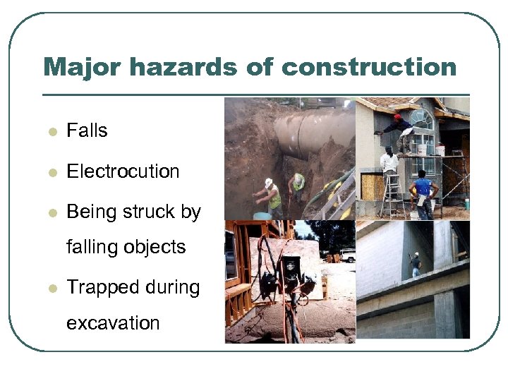 Major hazards of construction l Falls l Electrocution l Being struck by falling objects l Trapped during excavation