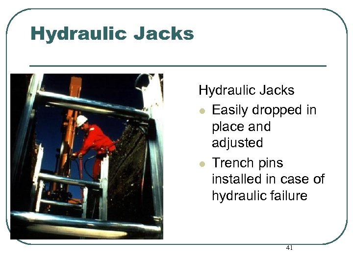 Hydraulic Jacks l Easily dropped in place and adjusted l Trench pins installed in case of hydraulic failure 41