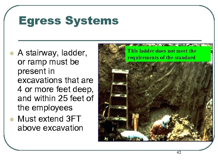 Egress Systems l l A stairway, ladder, or ramp must be present in excavations that are 4 or more feet deep, and within 25 feet of the employees Must extend 3 FT above excavation This ladder does not meet the requirements of the standard 42
