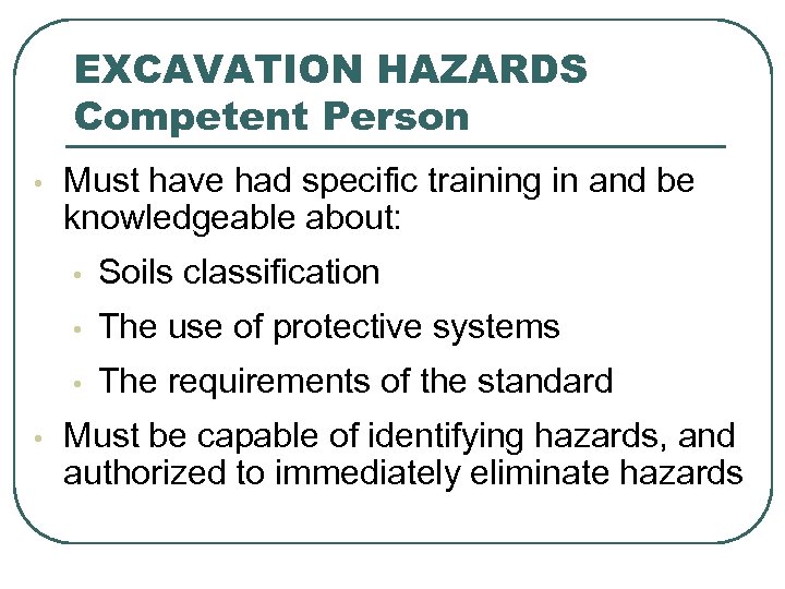 EXCAVATION HAZARDS Competent Person • Must have had specific training in and be knowledgeable about: • • The use of protective systems • • Soils classification The requirements of the standard Must be capable of identifying hazards, and authorized to immediately eliminate hazards