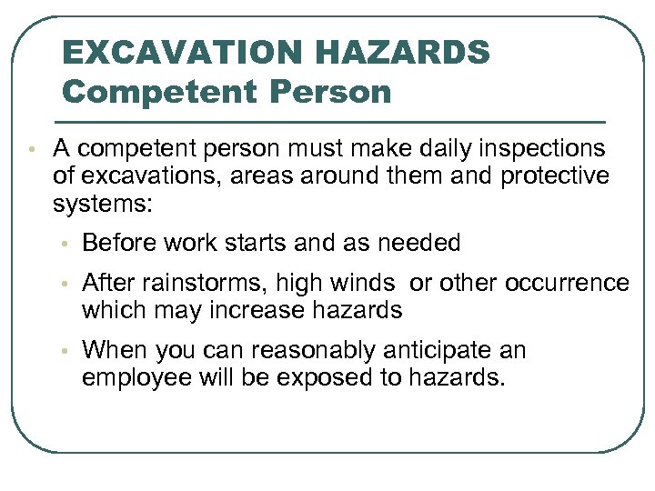 EXCAVATION HAZARDS Competent Person • A competent person must make daily inspections of excavations, areas around them and protective systems: • Before work starts and as needed • After rainstorms, high winds or other occurrence which may increase hazards • When you can reasonably anticipate an employee will be exposed to hazards.