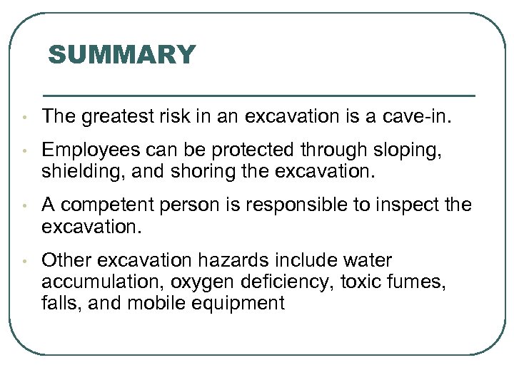SUMMARY • The greatest risk in an excavation is a cave-in. • Employees can be protected through sloping, shielding, and shoring the excavation. • A competent person is responsible to inspect the excavation. • Other excavation hazards include water accumulation, oxygen deficiency, toxic fumes, falls, and mobile equipment