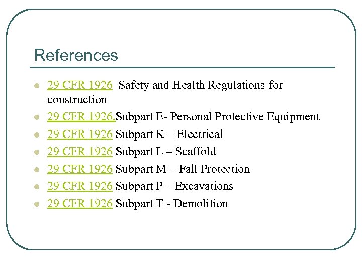 References l l l l 29 CFR 1926 Safety and Health Regulations for construction 29 CFR 1926. Subpart E- Personal Protective Equipment 29 CFR 1926 Subpart K – Electrical 29 CFR 1926 Subpart L – Scaffold 29 CFR 1926 Subpart M – Fall Protection 29 CFR 1926 Subpart P – Excavations 29 CFR 1926 Subpart T - Demolition