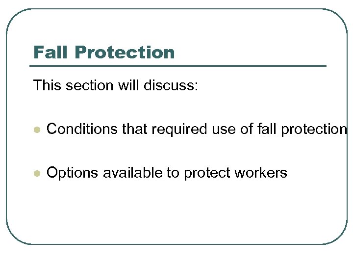 Fall Protection This section will discuss: l Conditions that required use of fall protection l Options available to protect workers