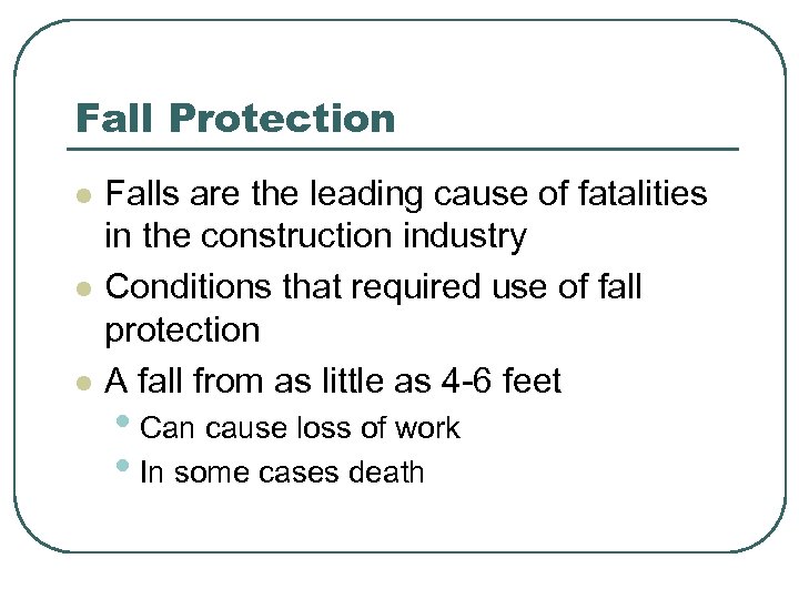Fall Protection l l l Falls are the leading cause of fatalities in the construction industry Conditions that required use of fall protection A fall from as little as 4 -6 feet • Can cause loss of work • In some cases death