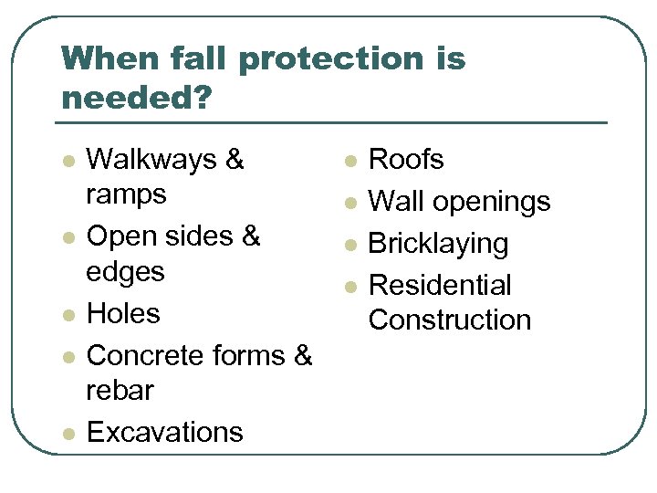 When fall protection is needed? l l l Walkways & ramps Open sides & edges Holes Concrete forms & rebar Excavations l l Roofs Wall openings Bricklaying Residential Construction