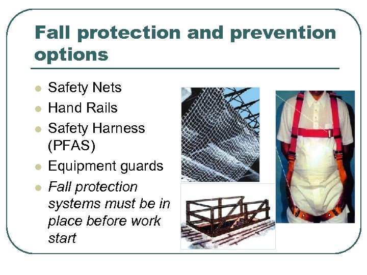 Fall protection and prevention options l l l Safety Nets Hand Rails Safety Harness (PFAS) Equipment guards Fall protection systems must be in place before work start