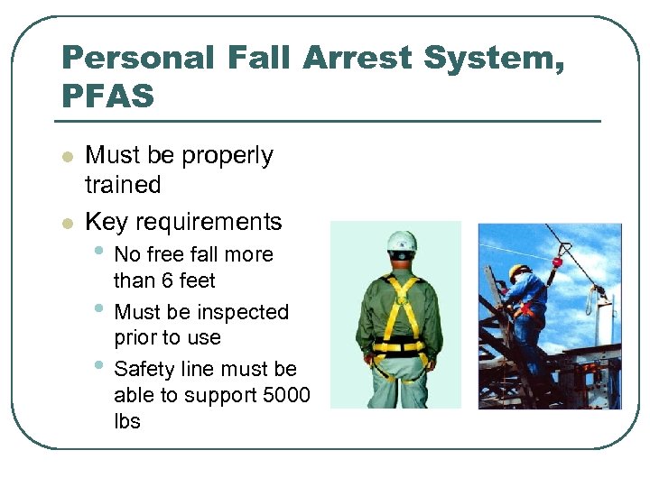 Personal Fall Arrest System, PFAS l l Must be properly trained Key requirements • No free fall more • • than 6 feet Must be inspected prior to use Safety line must be able to support 5000 lbs