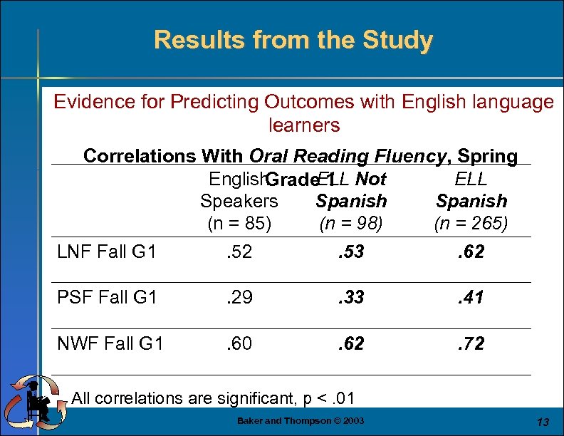 Predictive Power with Two Populations Native English Speakers r =. 52 English Language Learners r =. 62 Evidence for both the Predictive Variable and the Outcome Variable Baker and Thompson © 2003 12