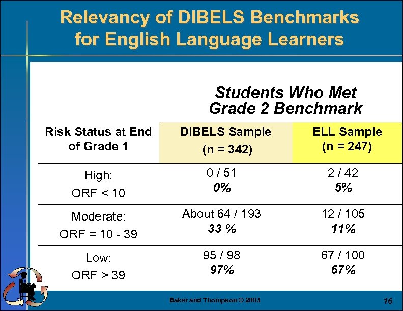 Results from the Study Predicting Reading Outcomes Over Time: The Shape of Things To Come English Language DIBELS Learner Sample Baker and Thompson © 2003 15