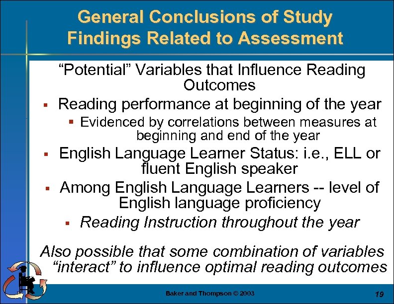 General Conclusions of Study Findings Related to Assessment § § § Evidence that DIBELS also measures important reading outcomes with English Language Learners Initial evidence that outcomes of English Language Learners at the end of Grade 1 is an important predictor of future reading performance If the second point is true then: A key issue becomes determining what influences reading performance at the end of Grade 1 Baker and Thompson © 2003 18