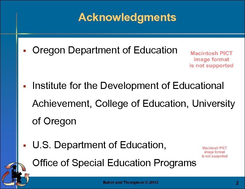 Acknowledgments § Oregon Department of Education § Institute for the Development of Educational Achievement, College of Education, University of Oregon § U. S. Department of Education, Office of Special Education Programs Baker and Thompson © 2003 2