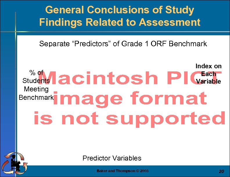 General Conclusions of Study Findings Related to Assessment § “Potential” Variables that Influence Reading Outcomes Reading performance at beginning of the year § Evidenced by correlations between measures at beginning and end of the year § § English Language Learner Status: i. e. , ELL or fluent English speaker Among English Language Learners -- level of English language proficiency § Reading Instruction throughout the year Also possible that some combination of variables “interact” to influence optimal reading outcomes Baker and Thompson © 2003 19