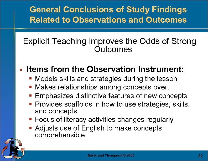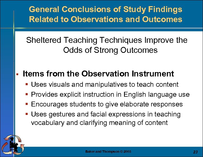 General Conclusions of Study Findings Related to Observations and Outcomes Explicit Teaching Improves the Odds of Strong Outcomes § Items from the Observation Instrument: § § Models skills and strategies during the lesson Makes relationships among concepts overt Emphasizes distinctive features of new concepts Provides scaffolds in how to use strategies, skills, and concepts § Focus of literacy activities changes regularly § Adjusts use of English to make concepts comprehensible Baker and Thompson © 2003 22