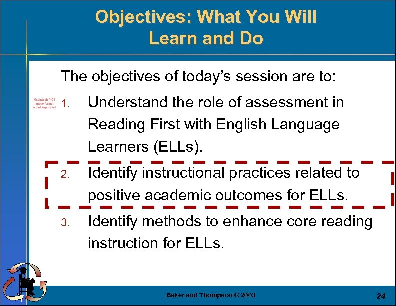 Objectives: What You Will Learn and Do The objectives of today’s session are to: 1. Understand the role of assessment in Reading First with English Language Learners (ELLs). 2. Identify instructional practices related to positive academic outcomes for ELLs. 3. Identify methods to enhance core reading instruction for ELLs. Baker and Thompson © 2003 24