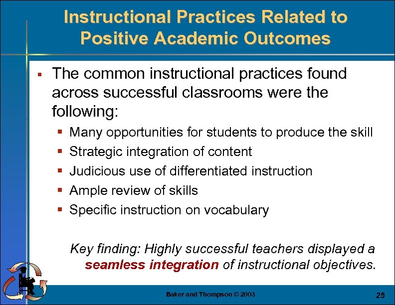 Instructional Practices Related to Positive Academic Outcomes § The common instructional practices found across successful classrooms were the following: § § § Many opportunities for students to produce the skill Strategic integration of content Judicious use of differentiated instruction Ample review of skills Specific instruction on vocabulary Key finding: Highly successful teachers displayed a seamless integration of instructional objectives. Baker and Thompson © 2003 25