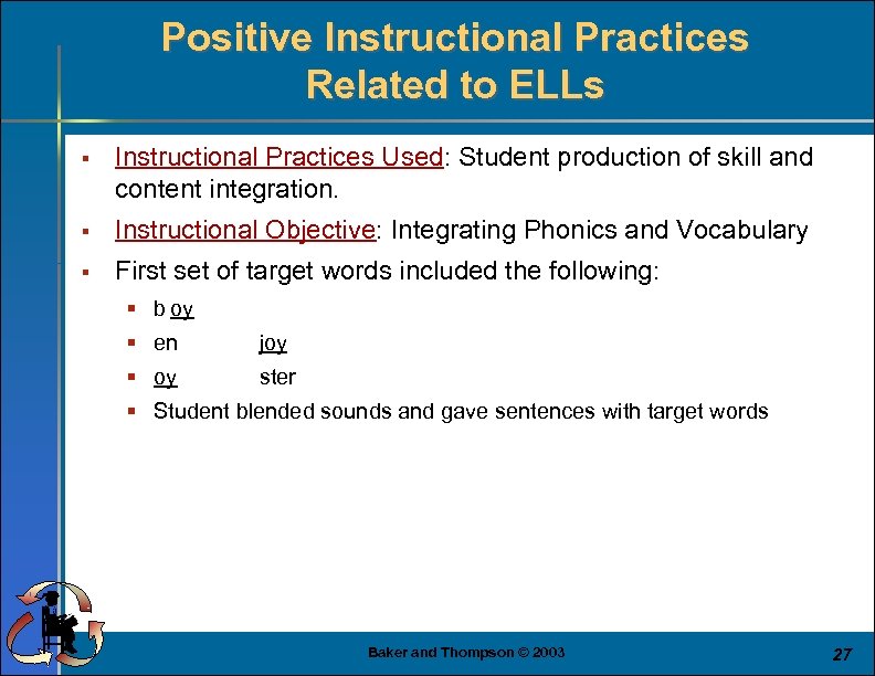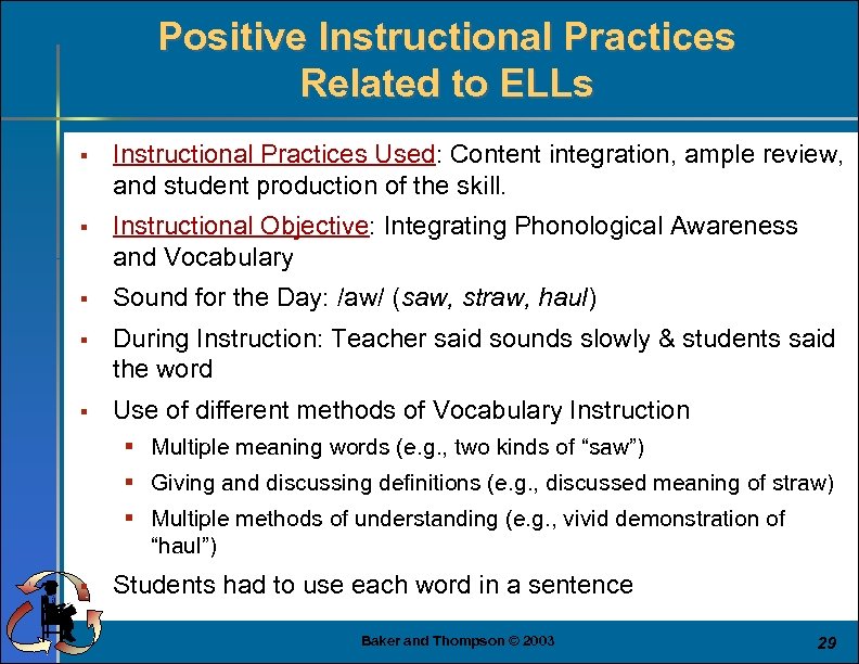 Positive Instructional Practices Related to ELLs § Instructional Practices Used: Student production of skill, content integration, and ample review. § Instructional Objective: Integrating phonics and vocabulary § Second set of target words included the following: § Voice, spoil, noise: § Each word defined by students or the teacher & used in a sentence § Discussion about similarity among words: voice, similar, noise, boy, enjoy, oyster § § § Students answer questions & discuss Critical objective was to make sure students understood sounds were the same but spellings were different Review 30 minutes later: students given definitions and required to identify target words Baker and Thompson © 2003 28
