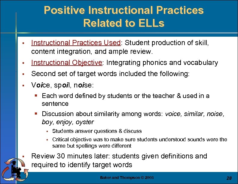 Positive Instructional Practices Related to ELLs § Instructional Practices Used: Student production of skill and content integration. § Instructional Objective: Integrating Phonics and Vocabulary § First set of target words included the following: § b oy § en joy § oy ster § Student blended sounds and gave sentences with target words Baker and Thompson © 2003 27