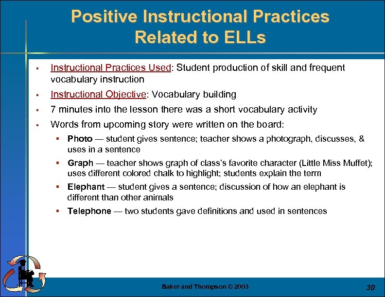 Positive Instructional Practices Related to ELLs § Instructional Practices Used: Content integration, ample review, and student production of the skill. § Instructional Objective: Integrating Phonological Awareness and Vocabulary § Sound for the Day: /aw/ (saw, straw, haul) § During Instruction: Teacher said sounds slowly & students said the word § Use of different methods of Vocabulary Instruction § Multiple meaning words (e. g. , two kinds of “saw”) § Giving and discussing definitions (e. g. , discussed meaning of straw) § Multiple methods of understanding (e. g. , vivid demonstration of “haul”) § Students had to use each word in a sentence Baker and Thompson © 2003 29