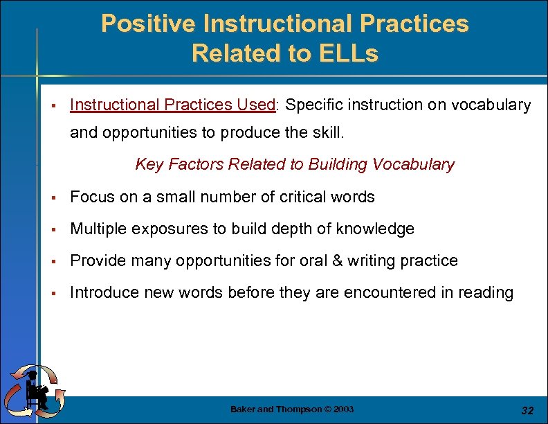 Positive Instructional Practices Related to ELLs § Instructional Practices Used: Judicious use of differentiated instruction and opportunities to practice the skill § Instructional Objective: Teaching phonological segmenting § Most Intense Instruction with Students Most At Risk § Daily small group instruction with three English language learners § During one lesson the target words were: fat, fit, fast, pit § Lesson emphasis on: § students hearing individual sounds; § seeing patterns (beginning /f/, middle vowel); § each student producing each sound multiple times Baker and Thompson © 2003 31