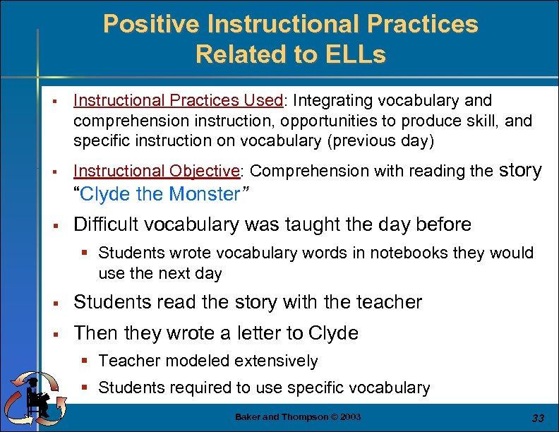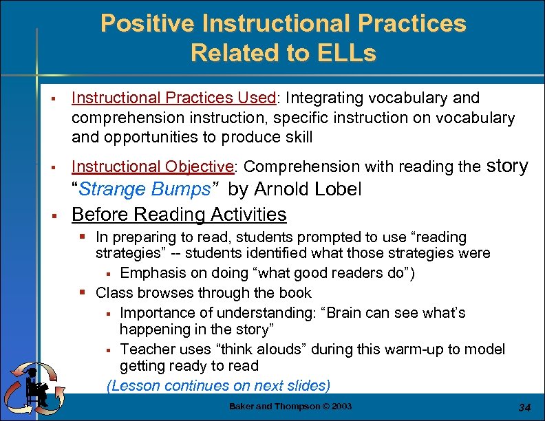 Positive Instructional Practices Related to ELLs § § Instructional Practices Used: Integrating vocabulary and comprehension instruction, opportunities to produce skill, and specific instruction on vocabulary (previous day) Instructional Objective: Comprehension with reading the story “Clyde the Monster” § Difficult vocabulary was taught the day before § Students wrote vocabulary words in notebooks they would use the next day § Students read the story with the teacher § Then they wrote a letter to Clyde § Teacher modeled extensively § Students required to use specific vocabulary Baker and Thompson © 2003 33