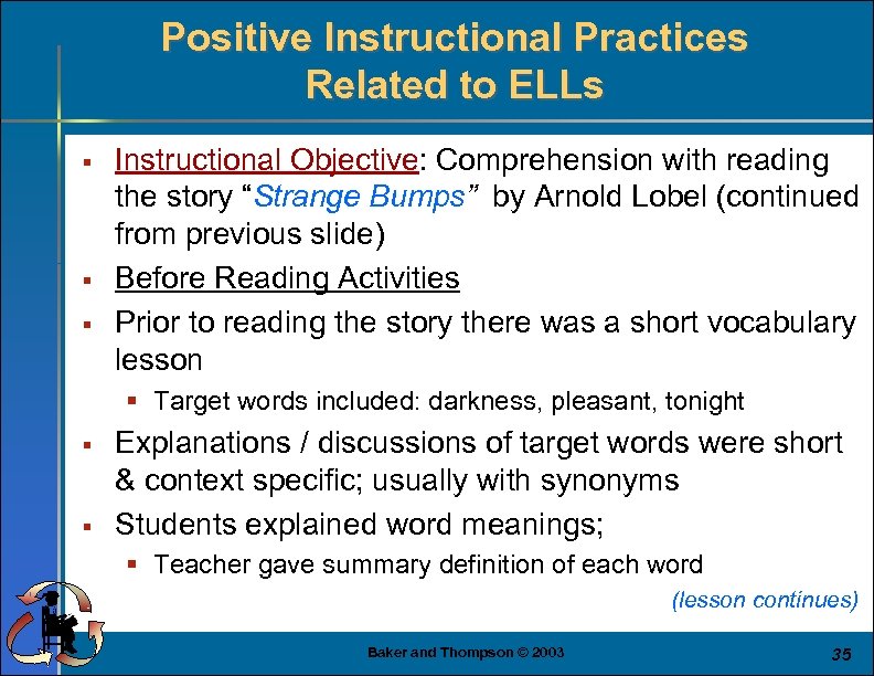 Positive Instructional Practices Related to ELLs § Instructional Practices Used: Integrating vocabulary and comprehension instruction, specific instruction on vocabulary and opportunities to produce skill § Instructional Objective: Comprehension with reading the story § “Strange Bumps” by Arnold Lobel Before Reading Activities § In preparing to read, students prompted to use “reading strategies” -- students identified what those strategies were § Emphasis on doing “what good readers do”) § Class browses through the book § Importance of understanding: “Brain can see what’s happening in the story” § Teacher uses “think alouds” during this warm-up to model getting ready to read (Lesson continues on next slides) Baker and Thompson © 2003 34