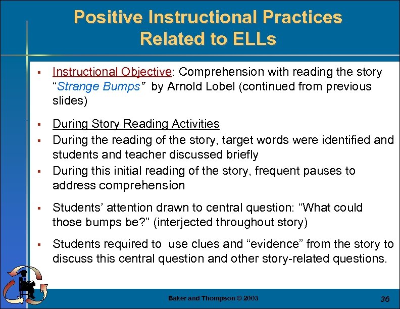 Positive Instructional Practices Related to ELLs § § § Instructional Objective: Comprehension with reading the story “Strange Bumps” by Arnold Lobel (continued from previous slide) Before Reading Activities Prior to reading the story there was a short vocabulary lesson § Target words included: darkness, pleasant, tonight § § Explanations / discussions of target words were short & context specific; usually with synonyms Students explained word meanings; § Teacher gave summary definition of each word (lesson continues) Baker and Thompson © 2003 35