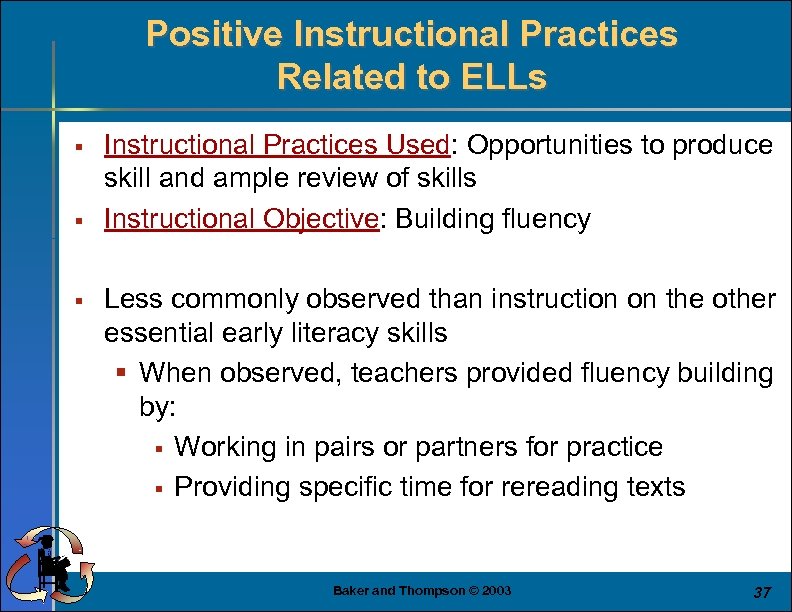 Positive Instructional Practices Related to ELLs § § § Instructional Practices Used: Opportunities to produce skill and ample review of skills Instructional Objective: Building fluency Less commonly observed than instruction on the other essential early literacy skills § When observed, teachers provided fluency building by: § Working in pairs or partners for practice § Providing specific time for rereading texts Baker and Thompson © 2003 37