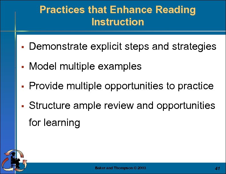 Practices that Enhance Reading Instruction § Demonstrate explicit steps and strategies § Model multiple examples § Provide multiple opportunities to practice § Structure ample review and opportunities for learning Baker and Thompson © 2003 41