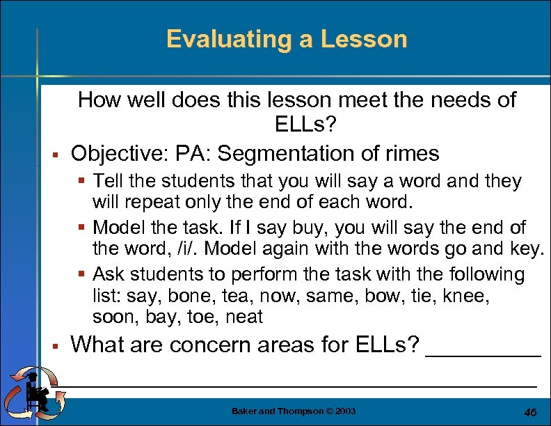 Evaluating a Lesson § How well does this lesson meet the needs of ELLs? Objective: PA: Segmentation of rimes § Tell the students that you will say a word and they will repeat only the end of each word. § Model the task. If I say buy, you will say the end of the word, /i/. Model again with the words go and key. § Ask students to perform the task with the following list: say, bone, tea, now, same, bow, tie, knee, soon, bay, toe, neat What are concern areas for ELLs? ________________________ § Baker and Thompson © 2003 46