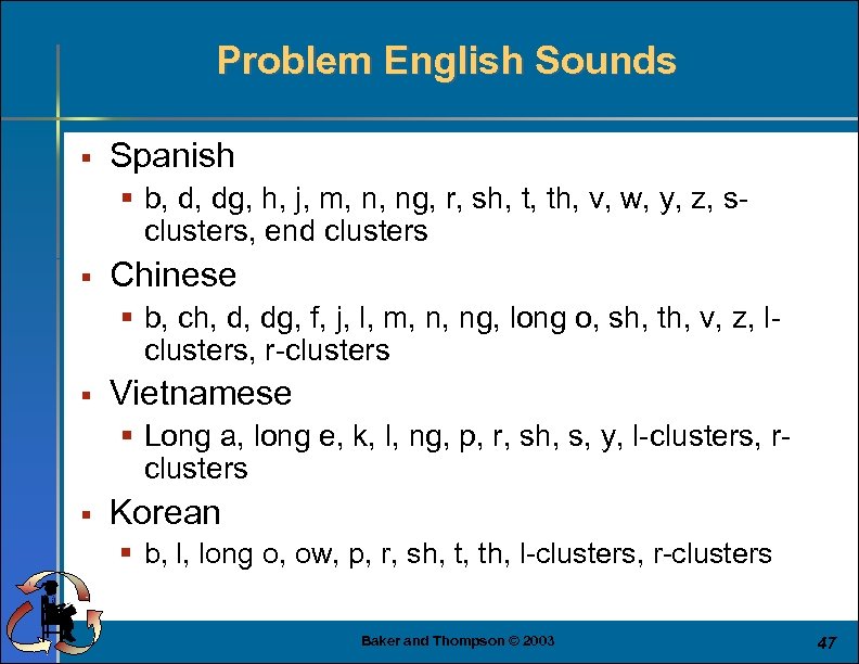 Problem English Sounds § Spanish § b, d, dg, h, j, m, n, ng, r, sh, t, th, v, w, y, z, sclusters, end clusters § Chinese § b, ch, d, dg, f, j, l, m, n, ng, long o, sh, th, v, z, lclusters, r-clusters § Vietnamese § Long a, long e, k, l, ng, p, r, sh, s, y, l-clusters, rclusters § Korean § b, l, long o, ow, p, r, sh, t, th, l-clusters, r-clusters Baker and Thompson © 2003 47