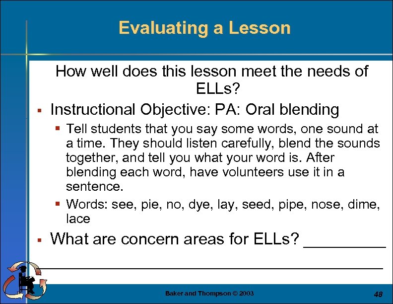 Evaluating a Lesson § How well does this lesson meet the needs of ELLs? Instructional Objective: PA: Oral blending § Tell students that you say some words, one sound at a time. They should listen carefully, blend the sounds together, and tell you what your word is. After blending each word, have volunteers use it in a sentence. § Words: see, pie, no, dye, lay, seed, pipe, nose, dime, lace What are concern areas for ELLs? ________________________ § Baker and Thompson © 2003 48