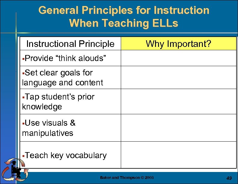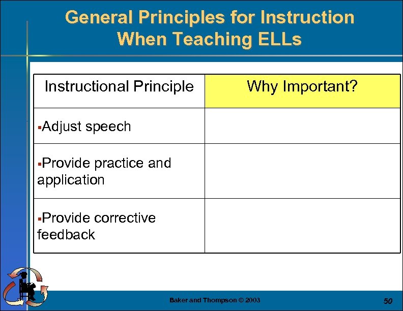 General Principles for Instruction When Teaching ELLs Instructional Principle §Provide Why Important? “think alouds” §Set clear goals for language and content §Tap student’s prior knowledge §Use visuals & manipulatives §Teach key vocabulary Baker and Thompson © 2003 49