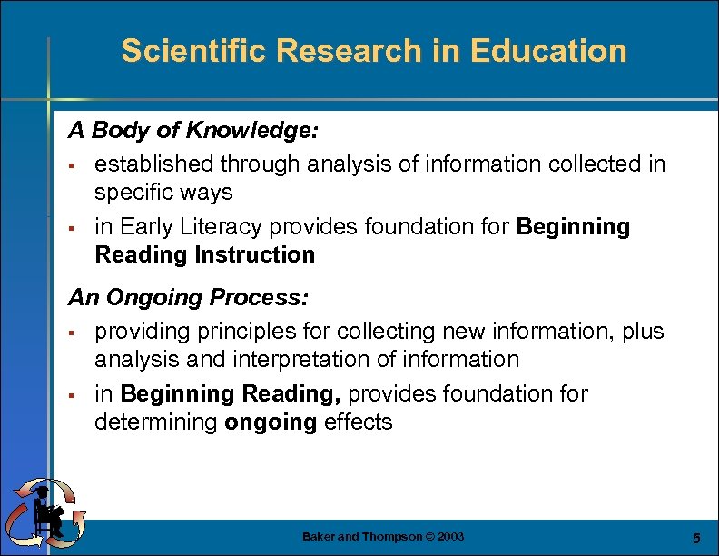 Scientific Research in Education A Body of Knowledge: § established through analysis of information collected in specific ways § in Early Literacy provides foundation for Beginning Reading Instruction An Ongoing Process: § providing principles for collecting new information, plus analysis and interpretation of information § in Beginning Reading, provides foundation for determining ongoing effects Baker and Thompson © 2003 5