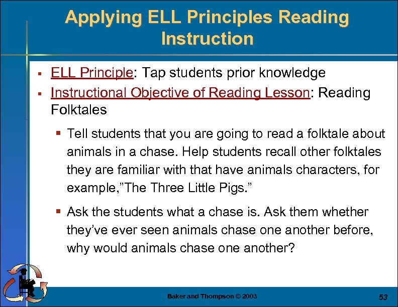 Applying ELL Principles Reading Instruction § § ELL Principle: Tap students prior knowledge Instructional Objective of Reading Lesson: Reading Folktales § Tell students that you are going to read a folktale about animals in a chase. Help students recall other folktales they are familiar with that have animals characters, for example, ”The Three Little Pigs. ” § Ask the students what a chase is. Ask them whether they’ve ever seen animals chase one another before, why would animals chase one another? Baker and Thompson © 2003 53