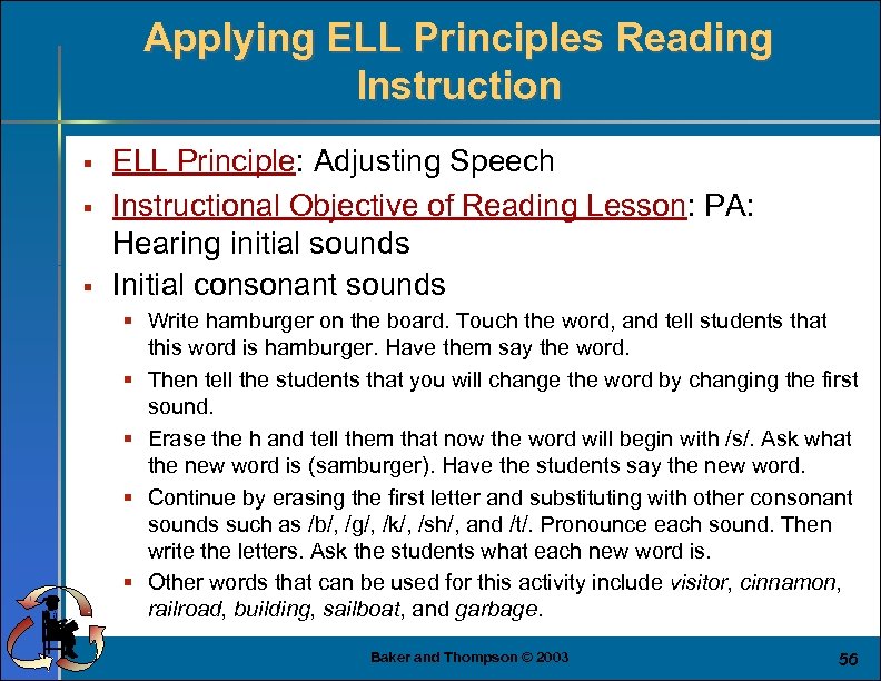 Applying ELL Principles Reading Instruction § § § ELL Principle: Adjusting Speech Instructional Objective of Reading Lesson: PA: Hearing initial sounds Initial consonant sounds § Write hamburger on the board. Touch the word, and tell students that this word is hamburger. Have them say the word. § Then tell the students that you will change the word by changing the first sound. § Erase the h and tell them that now the word will begin with /s/. Ask what the new word is (samburger). Have the students say the new word. § Continue by erasing the first letter and substituting with other consonant sounds such as /b/, /g/, /k/, /sh/, and /t/. Pronounce each sound. Then write the letters. Ask the students what each new word is. § Other words that can be used for this activity include visitor, cinnamon, railroad, building, sailboat, and garbage. Baker and Thompson © 2003 56