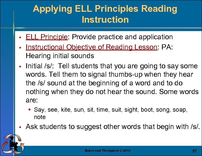 Applying ELL Principles Reading Instruction § § § ELL Principle: Provide practice and application Instructional Objective of Reading Lesson: PA: Hearing initial sounds Initial /s/: Tell students that you are going to say some words. Tell them to signal thumbs-up when they hear the /s/ sound at the beginning of a word and to do nothing when they do not hear the sound. Some words are: § Say, see, kite, sun, sit, time, suit, sight, boot, song, soap, note § Ask students to suggest other words that begin with /s/. Baker and Thompson © 2003 57