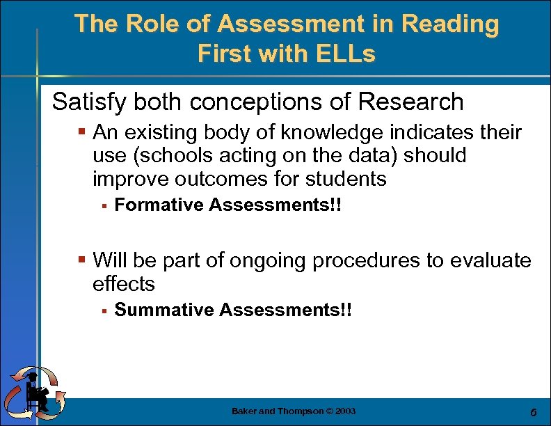 The Role of Assessment in Reading First with ELLs Satisfy both conceptions of Research § An existing body of knowledge indicates their use (schools acting on the data) should improve outcomes for students § Formative Assessments!! § Will be part of ongoing procedures to evaluate effects § Summative Assessments!! Baker and Thompson © 2003 6