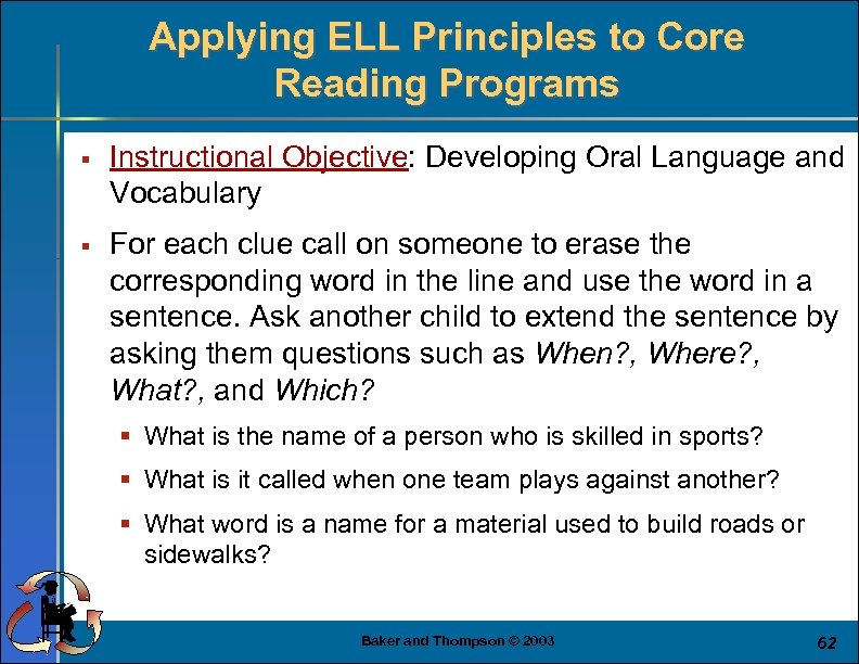 Applying ELL Principles to Core Reading Programs § Instructional Objective: Developing Oral Language and Vocabulary § For each clue call on someone to erase the corresponding word in the line and use the word in a sentence. Ask another child to extend the sentence by asking them questions such as When? , Where? , What? , and Which? § What is the name of a person who is skilled in sports? § What is it called when one team plays against another? § What word is a name for a material used to build roads or sidewalks? Baker and Thompson © 2003 62