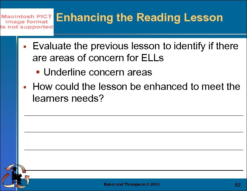 Enhancing the Reading Lesson § § Evaluate the previous lesson to identify if there areas of concern for ELLs § Underline concern areas How could the lesson be enhanced to meet the learners needs? Baker and Thompson © 2003 63