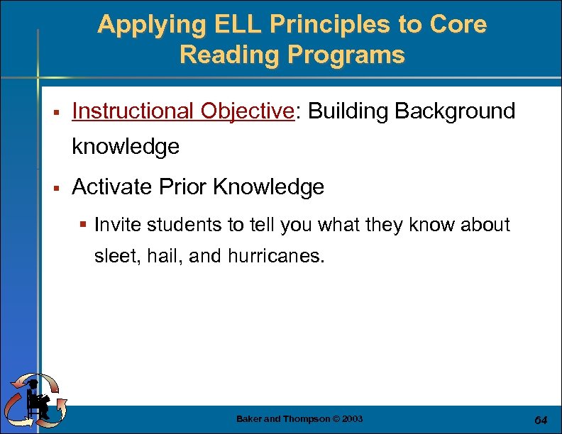 Applying ELL Principles to Core Reading Programs § Instructional Objective: Building Background knowledge § Activate Prior Knowledge § Invite students to tell you what they know about sleet, hail, and hurricanes. Baker and Thompson © 2003 64