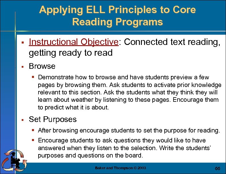 Enhancing the Reading Lesson § § Evaluate the previous lesson to identify if there areas of concern for ELLs § Underline concern areas How could the lesson be enhanced to meet the learners needs? Baker and Thompson © 2003 65