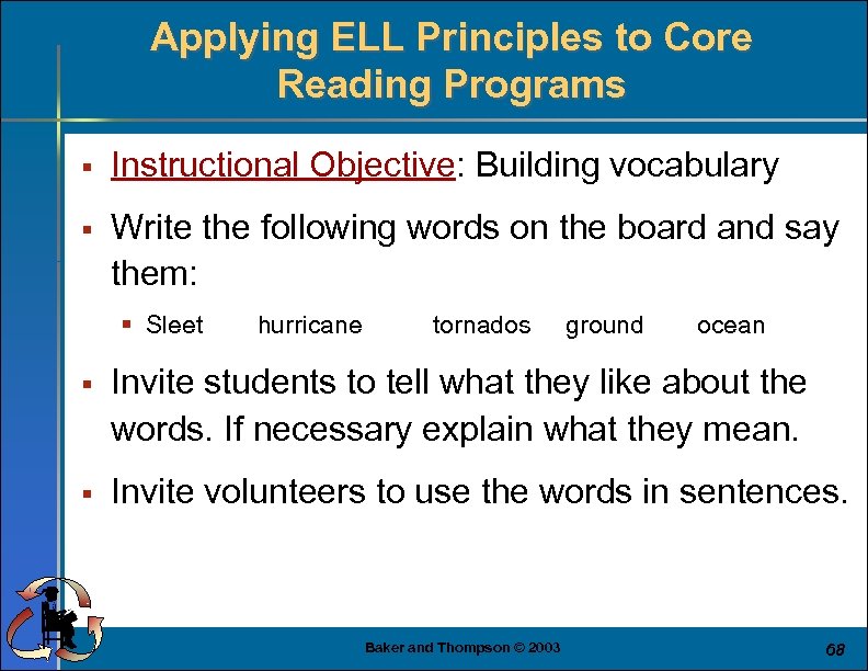 Applying ELL Principles to Core Reading Programs § Instructional Objective: Building vocabulary § Write the following words on the board and say them: § Sleet hurricane tornados ground ocean § Invite students to tell what they like about the words. If necessary explain what they mean. § Invite volunteers to use the words in sentences. Baker and Thompson © 2003 68