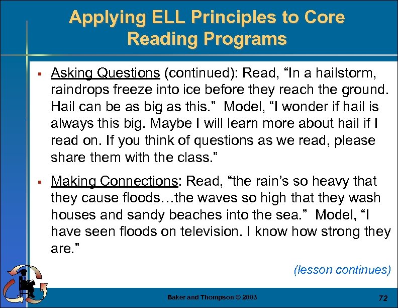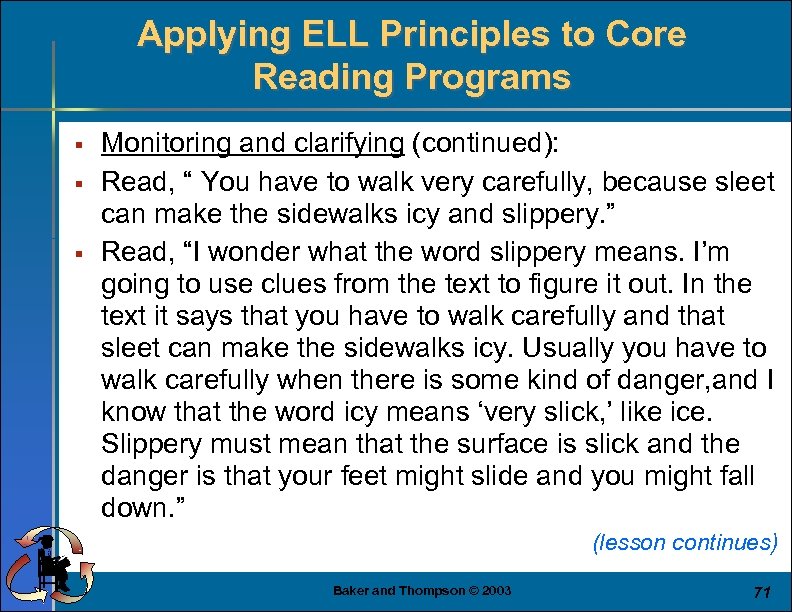 Applying ELL Principles to Core Reading Programs § § § Monitoring and clarifying (continued): Read, “ You have to walk very carefully, because sleet can make the sidewalks icy and slippery. ” Read, “I wonder what the word slippery means. I’m going to use clues from the text to figure it out. In the text it says that you have to walk carefully and that sleet can make the sidewalks icy. Usually you have to walk carefully when there is some kind of danger, and I know that the word icy means ‘very slick, ’ like ice. Slippery must mean that the surface is slick and the danger is that your feet might slide and you might fall down. ” (lesson continues) Baker and Thompson © 2003 71