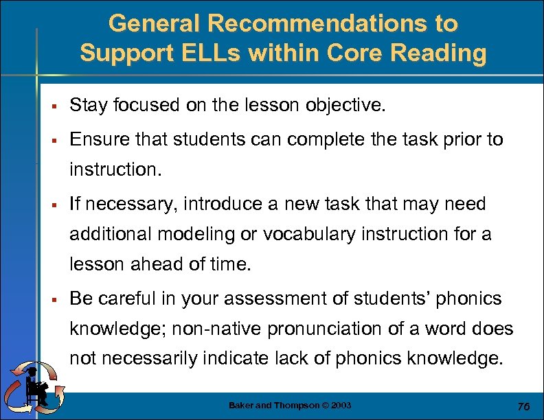 Enhancing the Reading Lesson § § Evaluate the previous lesson to identify if there areas of concern for ELLs § Underline concern areas How could the lesson be enhanced to meet the learners needs? Baker and Thompson © 2003 75