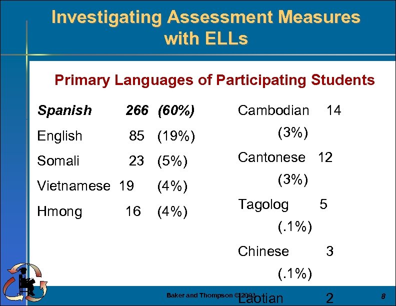Research on How Assessment Devices Work with ELLs Examples from a 2 -year study with English Language Learners Three objectives 1. Collect promising student reading measures with ELLs in Grade 1 2. Systematically observe beginning reading instruction in Grade 1 classrooms 3. Investigate the relationship between instructional practices in reading and student performance on reading measures Baker and Thompson © 2003 7