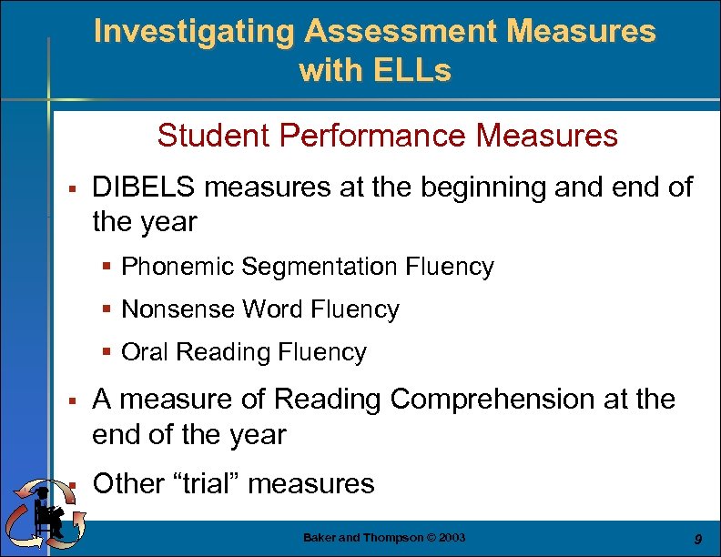 Investigating Assessment Measures with ELLs Primary Languages of Participating Students Spanish 266 (60%) Cambodian English 85 (19%) (3%) Somali 23 (5%) Vietnamese 19 (4%) Cantonese 12 (3%) (4%) Hmong 16 14 Tagolog 5 (. 1%) Chinese 3 (. 1%) Laotian Baker and Thompson © 2003 2 8